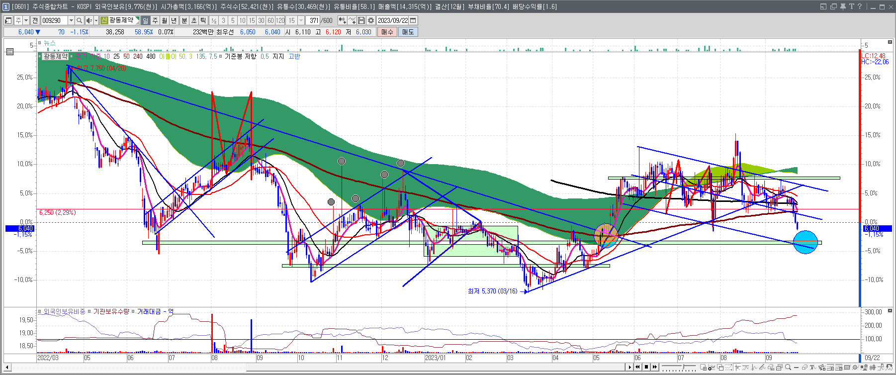 매도 가격대는 6,200원 부근으로 매수 이후 반등에 대한 손익비 폭이 작은 것이 흠. (거래량 작은것은 크나큰 흠.)