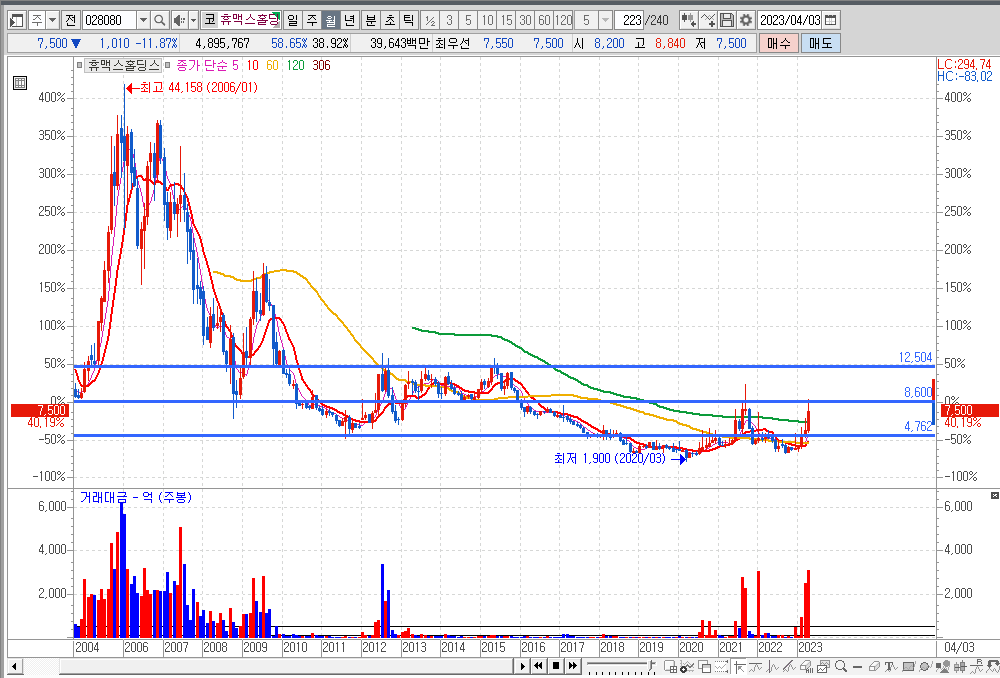 이후 다시 한번 상한가로 마감을 하는 모습이지만... 월봉상 맥점자리라 다음날 추가 상승없이 7,500원으로 마감합니다.