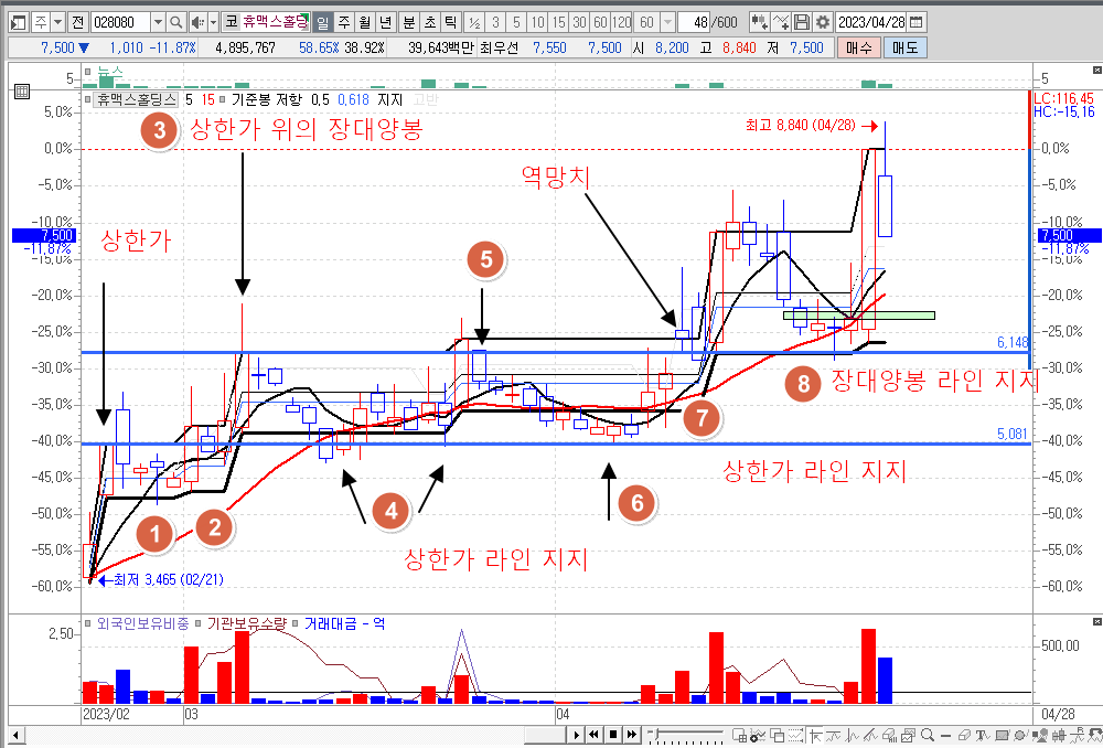 - 첫 상한가의 종가를 훼손하지만 이내 회복하여 3번 장대양봉의 중심선까지 반등 (상한가 종가의 강력한 지지선)